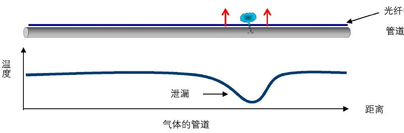 油氣管道泄漏時會引起泄漏點周圍溫度的變化,通過分布式光纖溫度傳感系統(tǒng)可以準確定位泄漏點。在天然氣管線介質(zhì)泄漏受壓情況下,氣態(tài)物質(zhì)導致的泄漏點的低溫,是由物質(zhì)的物理性質(zhì)、工藝條件和周圍環(huán)境所決定的。這些點的溫度異常可通過分布式溫度測量而獲得,并有很好的溫度、距離和反應時間精度。管道本身發(fā)生泄漏事故時,泄漏出的天然氣由于存在壓力,會向管道周圍發(fā)出噴射狀的氣體。如果能對整條天然氣管道在現(xiàn)有的壓力、流量探測技術基礎上,利用沿管道敷設的通訊光纜,接入分布式光纖測溫傳感主機,就能夠?qū)崟r探測到泄漏點,并進行泄漏點的定位和報警顯示。